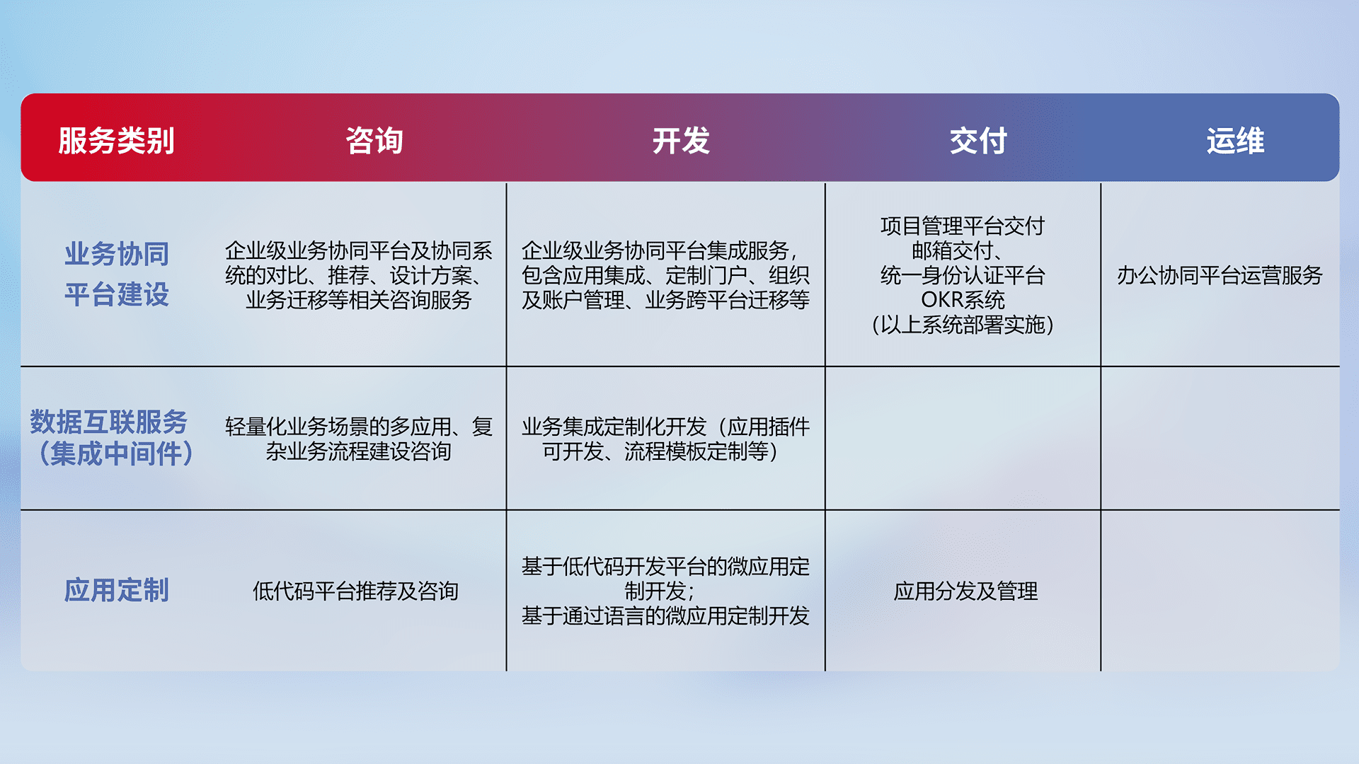 针对钉钉、、、、企微、、IDaas等平台级产品提供产品的规划、、、方案、、、、交付、、、定制化开发等服务,,实现如统一协同办公、、智能客户服务、、、、混合会议管理、、、、智能数据查询、、等业务场景,,,,实现数字化转型。。